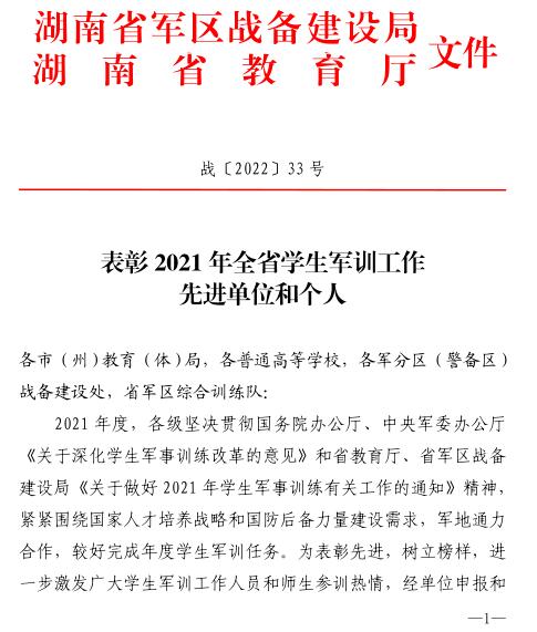 本网讯 近日,湖南省军区战备建设局、湖南省教育厅发文,对在2021年全省学生军训工作考评中取得优异成绩的28个普通高等学校和27个高中阶段学校予以通报。我校获评2021年全省学生军训工作先进单位。