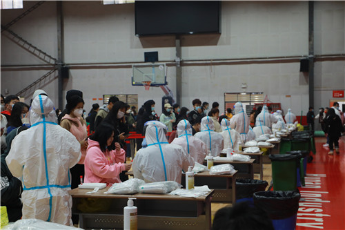 全体师生员工迅速响应号召,按照通知的时段分批有序前来训练馆,排队等候核酸采样。在志愿者的引导下,现场人员佩戴好口罩、保持一米间距、出示健康码、完成信息采集、接受采样,整个核酸采样现场井然有序。从早上8:30到中午13:00,高效顺利完成了11250人的核酸检测采样工作。
