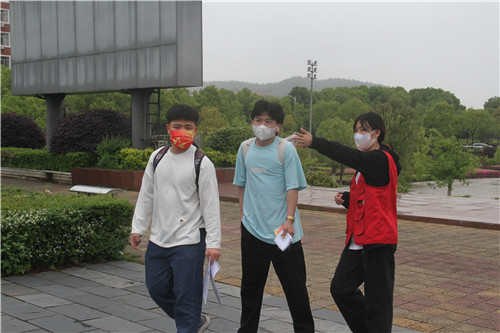 “同学们请上车,送到考场。”为方便第一次来校的学生,爱心车不断来回接送考生们;“同学,尚善楼在这边。”一路上,除了醒目的指示牌,还有志愿者们一路指引,帮助考生快速找到考场;“请同学们注意财产安全,不要丢失物品。”安保人员温馨提醒考生。