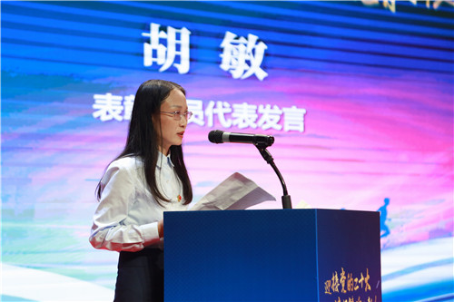 表彰人员代表、商务贸易学院胡敏老师与大家分享了带领团队夺得“创新创业”国赛一等奖的经验,并表示将永远做一根燃烧自我的蜡烛,照亮学生前行的道路。