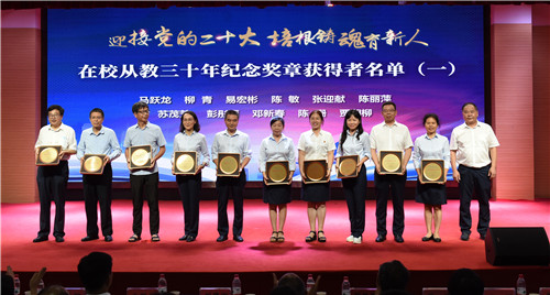本网讯 “今天,我们讲述老师的故事,走进这美丽的心灵;今天,我们唱响红烛的赞歌,向最美的园丁致敬。”9月9日,我校1102报告厅被温暖与感动包围,2022年学校教师节庆祝大会在一首学生朗诵的诗歌中拉开帷幕。本次大会首次颁发从教30年纪念章、举行荣休仪式、新进教师宣誓仪式,表彰在各领域作出重要贡献的教职工代表。大会设1个主会场和2个分会场,党委书记刘建湘、校长向罗生等全体校领导、全体教职工参加此次盛会。