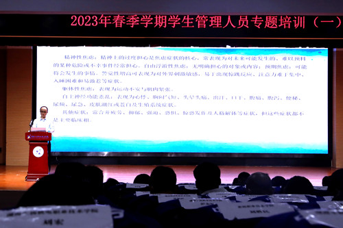 本网讯 为全面加强学校学生管理工作队伍建设,提升学管人员心理健康教育工作的能力,3月9日下午,学校在尚善楼1102开展2023年春季学期学生管理人员专题培训。湖南省第二人民医院主任医师曾宪祥作《大学生常见心理问题的识别与处理》主题讲座,学生工作部主要负责人、各二级学院党总支副书记、全体辅导员、班主任和心理健康教育与咨询中心专职教师共150余人参加。培训由学生工作部部长杨文斌主持。