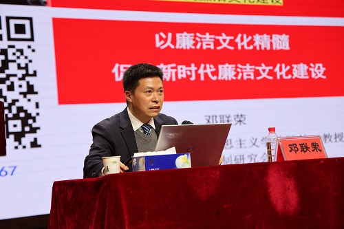 湖南工商大学马克思主义学院院长邓联荣以“以廉洁文化精髓 促进新时代廉洁文化建设”为主题开讲