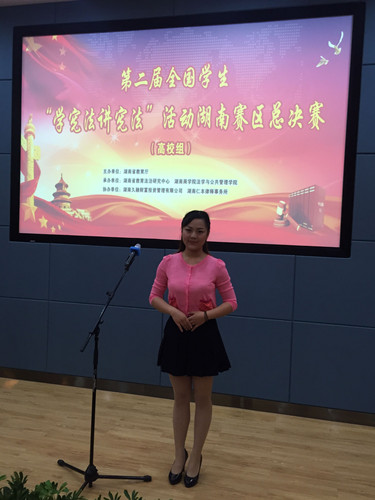 总决赛历时一天,紧张而有序,激烈而精彩。比赛中,同学们结合自身学习经历、感悟和时政热点,从讲宪法故事、对宪法的认识与体会、论时政热点中的法律常识、谈宪法精神等多个角度,充分展现了湖南省当代青少年的宪法知识水平。我校向粤同学以《网贷,请仗法律之剑》为题,短短5分钟的演讲,她以鲜明的观点、生动的事例、真切的情感,声情并茂地展现了自己对宪法的认识,具有较强感染力。经过激烈角逐,向粤获高校组一等奖。