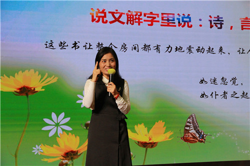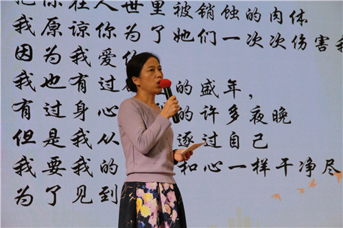 “一场与青春的美丽邂逅,一次与诗歌的亲密相逢”。曾红艳老师贴近生活的演讲方式、爽朗灿烂的笑容吸引了听众们的注意力,结合多种类型的名诗名词甚至名曲歌词,展示了古今中外诗词的魅力。伴随着对学生时代成长心情的分享,她巧妙的将诗人们比喻成自己青少年时期的父亲、兄长、闺蜜,带领听众们进入了一个美轮美奂的诗词世界,风趣的语言时常引得听众们会心一笑。