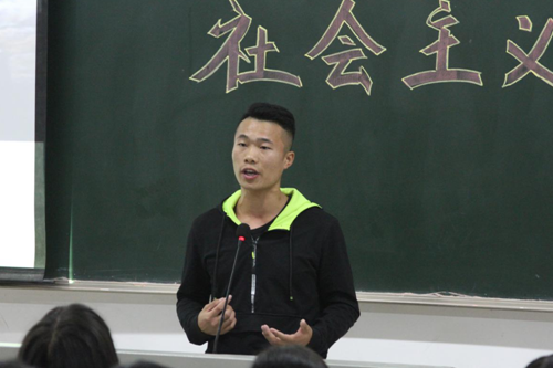 新能源2016-1班李召源同学发言:“习近平总书记说我们这个时候比以往任何时候都更加接近中华民族伟大复兴的时刻,这是历史决定的,所以我们当前必须顺应历史发展去做出自己的努力。我相信中国共产党的领导,相信我们国家会越来越强大,人民会越来越幸福。”
