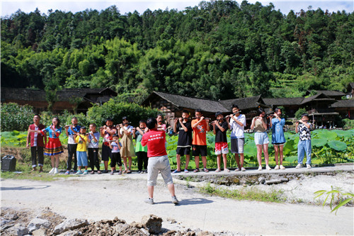 我校离退休工作处副处长刘芬和头车村村支书邓世龙身穿民族服装,与孩子们互动,伴着清脆的笛声,一首《小背篓》飘荡在古寨荷塘的上空。