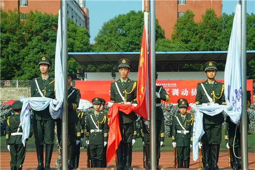 最后,成涛向新生军训团授予团旗。2023级全体新生正式踏上为期14天的军训生活,军训内容包括共同条令教育与训练、射击与战术训练、防卫技能与战时防护训练、战备基础与应用训练、国防意识教育、消防及反电诈等专题安全教育内容。