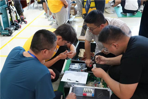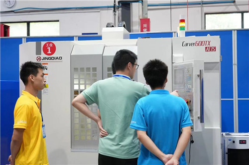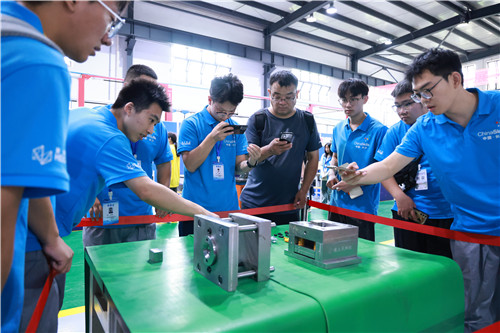 在志愿者的引导下,参赛队伍依次进入赛场内部进行限时观摩。赛场内,每台机器设备区域都有一名志愿者介绍赛场秩序以及注意事项;公共区域则安排技术人员对竞赛设备及所用系统进行答疑解惑,选手们和随队指导教师、领队们细心聆听,尽快熟悉竞赛设备。