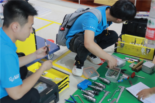 比赛前,选手们分批次进行刀具检录。各组来到“工具存放区”,在裁判员监督下,分批次拆封所带来的竞赛刀具,积极配合裁判员的审查工作,志愿者对照竞赛刀具清单逐一检查竞赛工具是否齐全,对设备是否存在违规情况进行审核,登记无误后,将其放入刀具箱再次贴上封条,以保证比赛的公平、公正、公开。