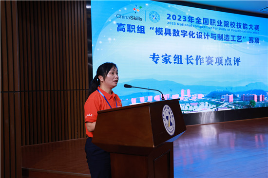 专家组长魏清兰做赛项点评,她表示本届比赛更加贴近实际生产流程,以质量为指引,聚焦产品,培育了精益求精的工匠精神。比赛共分为两阶段三模块,第一个阶段是模具数字化设计,第二个阶段是模具数字化制造与智能化注塑成型。赛题侧重产品精度检测,对制作出来的产品采用三坐标测量。参赛选手们整体水平较高,完成度高,竞赛平台均满足赛项要求,赛场布置效果良好。