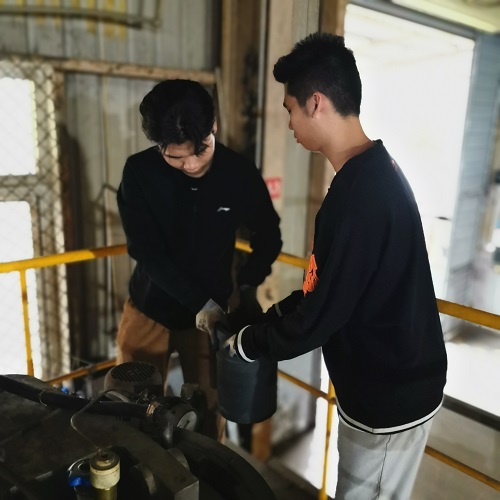 团队选择与湖南浩威特科技发展有限公司开展合作,经常是学校公司两地跑,既要完成产品设计的“脑力活”,又要干手提重物的“体力活”。他们经常提着10斤重的坩埚爬上4米高的炉子顶部,打开重约100斤的炉盖,将金刚石、铜锭和坩埚一起放置在炉中。炉子运作起来里面的温度高达上千摄氏度,炉外温度接近40摄氏度,大家厚厚的工装都可以拧出汗水,脸蛋也被“烤”得通红。
