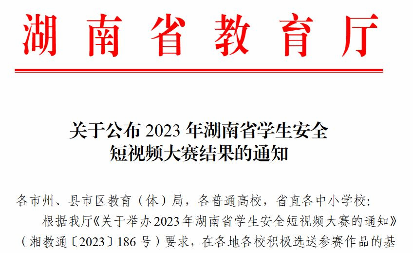 本网讯 10月23日,湖南省教育厅公布了《2023年湖南省学生安全短视频大赛获奖名单》,我校师生的作品在比赛中再次荣获佳绩,荣获教师组一等奖2项,三等奖3项;学生组一等奖1项,二等奖3项,获奖成绩名列省内高校前列。
