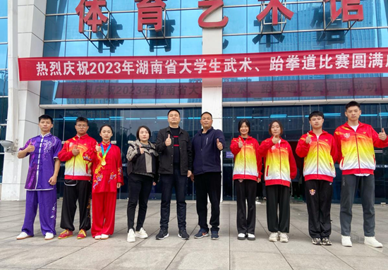本网讯 近日,2023年湖南省大学生武术比赛在湖南开放大学圆满落幕。来自全省44所高校的341名大学生运动员同台竞技,呈现了一场高水平的武术盛宴。我校武术队在教练员黄雯、刘洋两位老师的带领下,八名运动员参赛,经过数月紧张而艰苦的备战和激烈的角逐,获得了一金三铜的好成绩,实现了建队以来金牌零的突破。