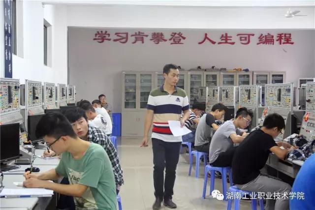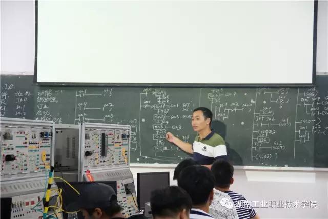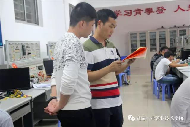 第一批考核的学生按要求在指定位置坐好后,何其文向学生展示今天的考核题目并讲述考核的要求:“要将程序、接线图、I/O分配写到资料上,然后在仪器上接好线。”