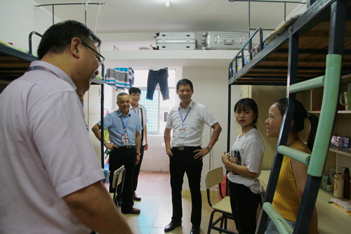 校长向罗生一行查看新生宿舍环境并与新生亲切交谈