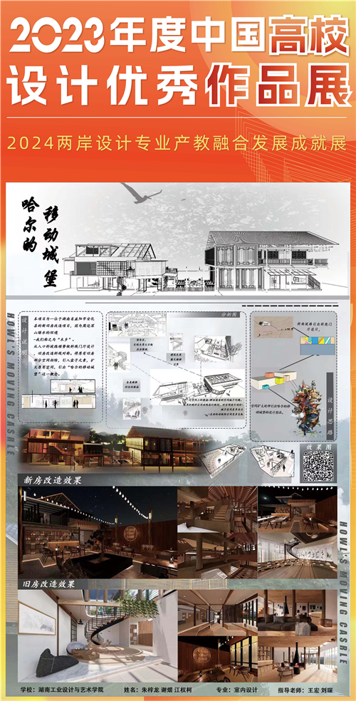 电子pg游戏平台下载作为湖南省唯一一所高职院校应邀参加2023年度中国高校设计优秀作品展,参展项目为王宏、刘琛老师指导朱梓龙、江权柯、谢熠设计的作品“哈尔的移动城堡”及黄柏梅、卢明凡、罗思倩设计的作品“新茶旧社”,赢得了众多参观者的赞誉和好评。