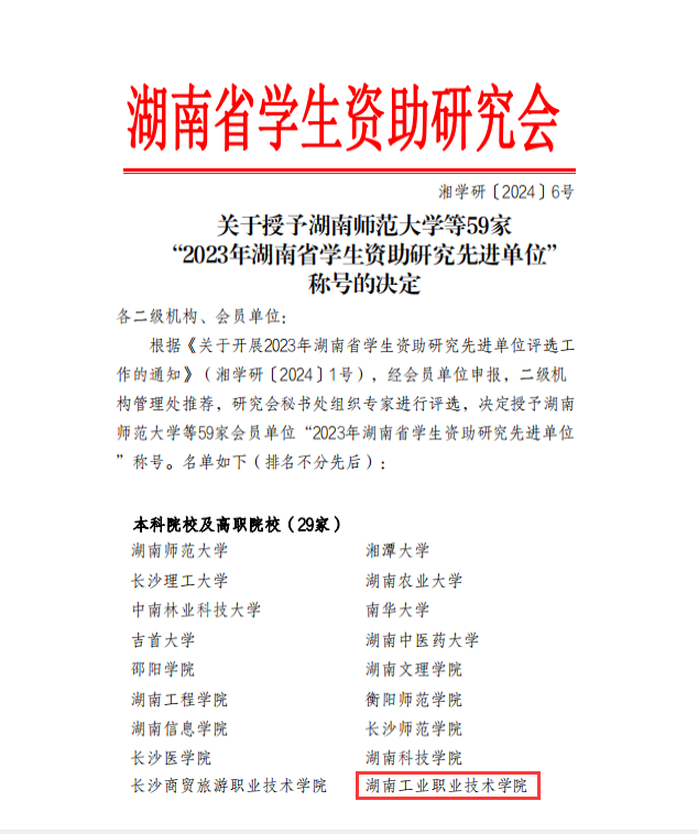 本网讯 近日,湖南省学生资助研究会2023年度评优结果揭晓,我校获评“2023年湖南省学生资助研究先进单位”,这是我校连续第8年获奖。
