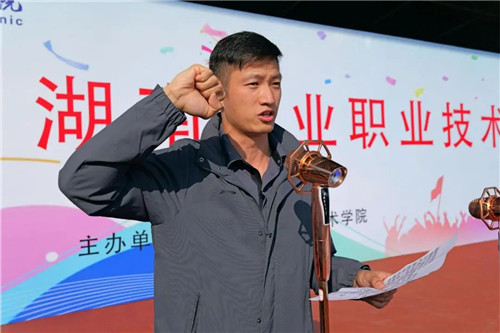 随后,运动员代表、商务贸易学院市营2022-1班向紫鑫同学和裁判员代表、体育艺术部老师廖刚分别代表全体运动员和全体裁判员宣誓。