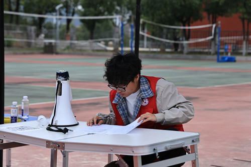 机电24-1班的鲁瑾浩手持参赛名单,正在逐人认真核对。“我们早上7:20到岗,晚场结束后还要再忙半小时才离开,整日奔波忙碌虽辛苦,但也让我体会到——每一份付出,其实都是在为这场赛事的有序进行默默助力。”