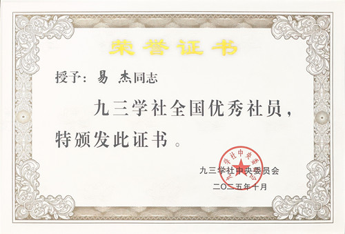 本网讯 近日,九三学社中央印发《九三学社中央关于表彰全国优秀社员、全国优秀社务工作者、全国优秀省级组织和全国优秀基层组织的决定》,对各领域表现突出的先进集体与个人予以表彰。我校科技处处长、九三学社社员易杰教授荣获“全国优秀社员”荣誉称号。