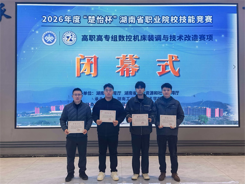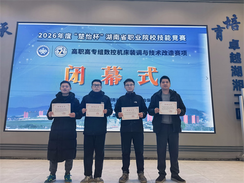 本网讯 随着比赛开始的哨声响起,现场指示灯闪烁,操作面板上红色警报此起彼伏,每位选手要在180分钟内,从15处预先设置的故障中逐一排查,修复精度,重装主轴,最终现场切削出一件精密零件以检验“修复”效果……2月9日,2026年“楚怡杯”湖南省职业院校技能竞赛“数控机床装调与技术改造”赛项在我校闭幕,来自全省10所高职院校和技工院校的38名参赛选手同台竞技,展示风采。经过激烈比拼,我校陈宇轩、陈名浩(指导老师:徐永波、陈年华)获得该赛项一等奖第一名,学生易鸣轩、戴睿鑫(指导老师:吴利清、熊志林)获得该赛项二等奖第一名。
