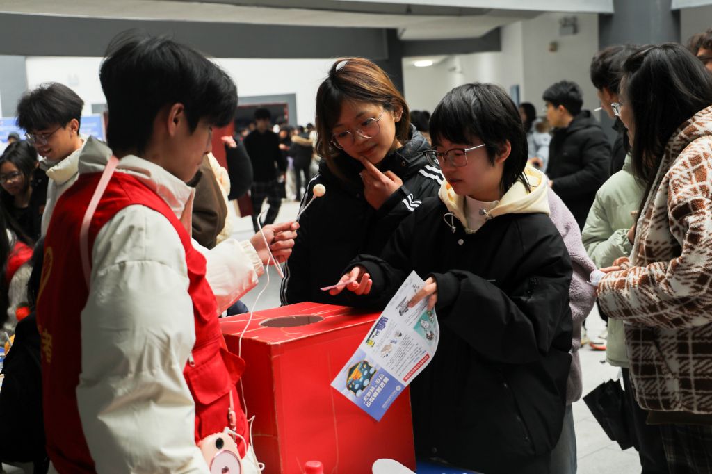 “盲盒抽到‘帮图书馆整理书架半小时’,我这就去!”在“雷锋行动盲盒大挑战”打卡点,同学们争相抽取盲盒,随机接受一项微志愿服务任务,完成即可集章兑换小礼品。这种趣味闯关的形式,让志愿服务变得像游戏一样有趣,也让大家在“玩”中体会到了助人的快乐。现场还有“青春旋律大挑战”“雷锋知识大比拼”等打卡点,歌声、笑声、答题声交织,青春的活力与雷锋精神的温暖碰撞出别样火花。