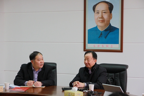 院长刘建湘教授(左)向韩之俊教授介绍学院基本情况