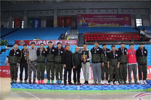 男篮决赛则在我院与老对手长沙民政之间展开。比赛开局第一节我院以1比9落后,球员们奋力追分,但是首节结束时最大分差被拉到12分,开局的不利让队员和教练员心中都万分焦急。见此情况,教练员暂停比赛并调整比赛战略,在第二节时对民政学院发起猛攻,吹响追分的号角。通过加大防守强度,针对对方实际情况改变我方的进攻方式,在全队齐心协力下,在上半场结束时将比分追至仅相差1分。下半场比赛中,两队比分交替领先,进入白热化,双方观众高喊加油,球员奋力追分,但在关键时刻,对手连续命中两记三分球,使得分差再次被拉大。时间所剩无几,比分难以追回,但球员们没有放弃,继续奋战,最终以4分惜败,夺得比赛亚军,并拿到全国赛入场券。