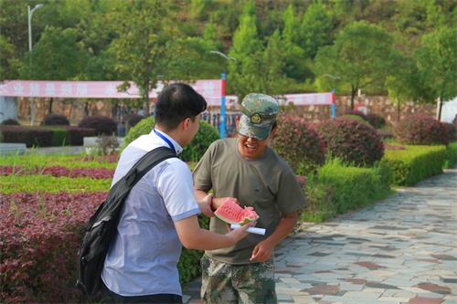 天气炎热,助教为教官送上爽口的西瓜。