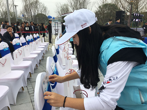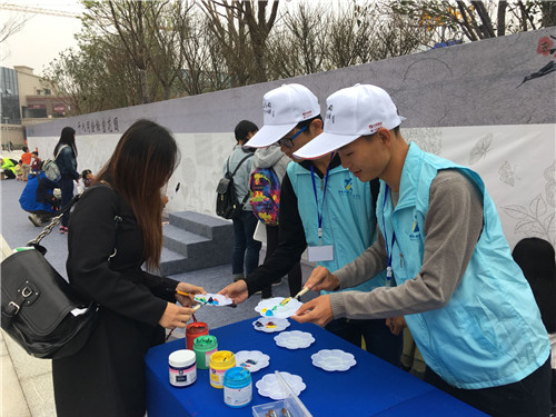 志愿者为参与“千人同绘《秘密花园》”活动的人员提供服务