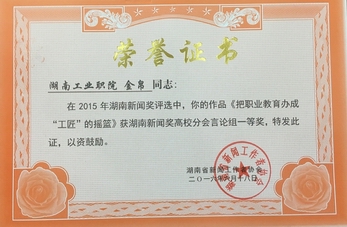 高校校报研究会还在会上进行了表彰颁奖。国防科大、中南大学、湖南师范大学、湖南农大、长沙理工大学、湖南科技大学、吉首大学、湖南工业大学、湖南城市学院校报编辑部等荣获“十佳”,我院是唯一获此殊荣的高职院校。由我院金帛撰写的言论《把职业教育办成“工匠”的摇篮》摘得湖南省新闻奖一等奖。