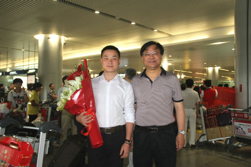 我院党委副书记陈超(右)来到机场迎接陈义(左)