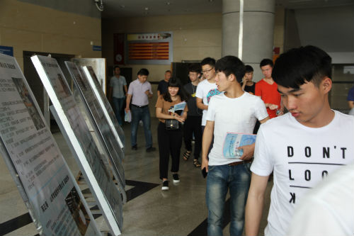 在图书馆大厅展出的技能大师简介展板吸引了众多学生驻足观看