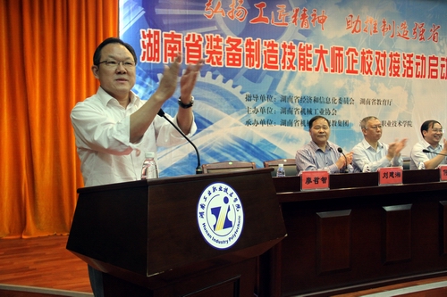 湖南省经济和信息化委员会副主任黄东红、湖南省机械工业协会会长何建国、湖南省教育厅职成处副处长朱日红、我院党委书记熊琦、我院院长刘建湘、湖南省汽车技师学院院长廖哲智、湖南机电职业技术学院副院长任丕顺、湖南电气职业技术学院副院长谭元发等出席启动仪式,湖南机电职业技术学院、湖南电气职业技术学院、湖南汽车技术学院及我院相关专业教师,中联重科、三一重工、中车株机、湘电集团、铁建重工、华菱集团等省内装备制造重点企业的二十多位国家级、省级技能大师,全国、全省劳模等参加了启动仪式。启动仪式由廖哲智主持。