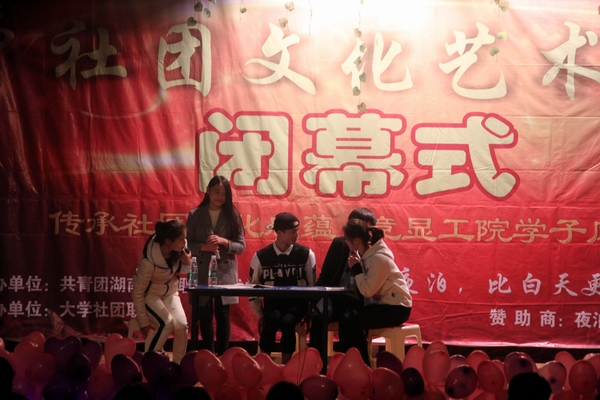 起点音乐协会的吉他弹唱为闭幕式拉开了序幕。伍俊晖为闭幕式晚会致辞并宣读星级社团名单及优秀成员名单;社联主席李思月、副主席李冬为三星级社团电子协会、双截棍协会、轮滑协会、棋牌协会、畅游旅游协会、four摄影协会进行颁奖;伍俊晖为四星级社团楚艺书法协会、曳舞社、青年志愿者协会颁奖;黄敏为五星级社团天心阁文学社颁奖。
