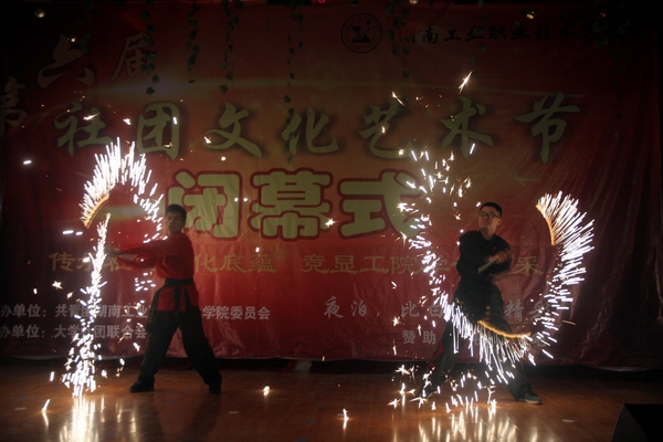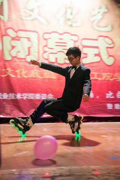 晚会现场,某次元动漫社cosplay走秀及舞蹈以各种奇异装扮吸引观众眼球,瞬间将观众带入了动漫的二次元世界;G-six轮滑协会《轮舞青春》博得观众掌声连连,爱的华尔兹轮滑之舞带来爱的浪漫气息;双节棍协会带来夜光双节棍表演、烟花双节棍表演等,引得现场尖叫声不断,更有双节棍碎苹果震慑人心;技艺高超的B-BOX秀用六种不同声音做串烧,同曳舞协会动感帅气的舞姿一并将晚会推向高潮;黑马话剧社《相亲》、商贸系Youth英语协会《英语歌曲串烧》、体育舞蹈协会《拉丁舞伦巴》为闭幕式增添光彩;最后,院社联合唱歌曲《相信我们会创造奇迹》为闭幕式画上圆满句号。