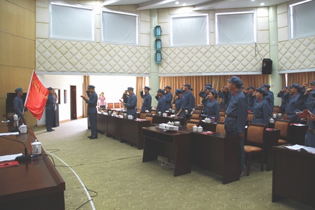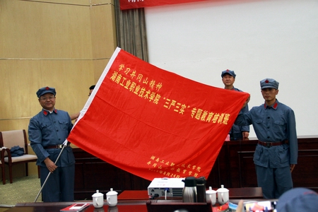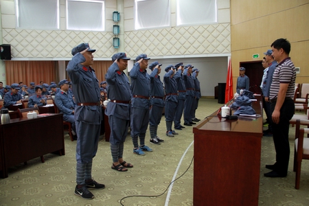 我院党委书记熊琦为全体学员逐一授予了红军帽。党委副书记陈超代表我院从井冈山干部教育学院指导员手中接过班旗,并带领全体学员面向班旗进行了宣誓。
