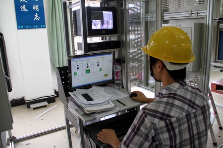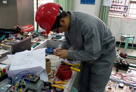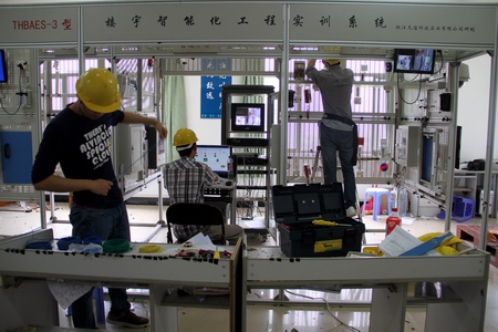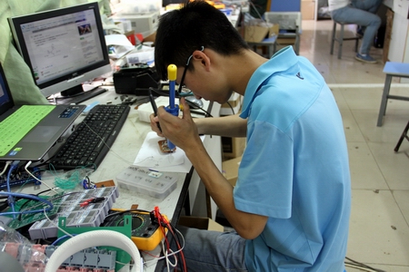邓敏敏同学负责装器件,肖震宇同学负责做线,谭庄同学负责程序调试,一切秩序井然。一个多月从早到晚的集训和练习,让他们在实践操作中获得了比课堂上更大的收获。