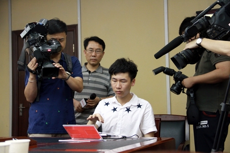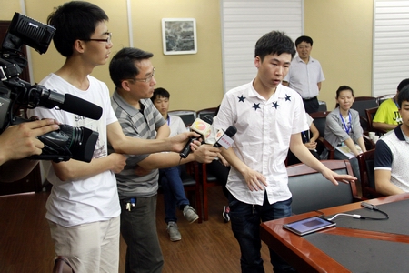 自由采访中,张江杰同学为媒体演示“哑语转换系统”的操作方法,并讲述了此项发明产生的过程。媒体记者们还围绕我院在支持学生个性化发展和创新创业方面对陈超、贺德高及张江杰的辅导员廖敏进行了采访。