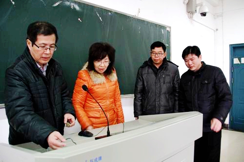 教学系统相关负责人在教室检查多媒体试运行情况