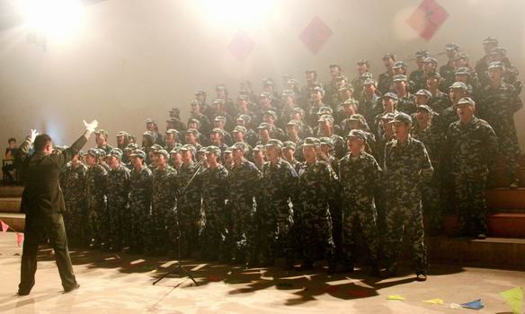 宽阔平整的训练场,身穿蓝色军训服装的学子,迈着整齐如一的步伐登台演唱,浑身散发军人的骄傲。当《打靶归来》、《精忠报国》、《地道战》、《军中绿花》等歌曲在观众耳边响起的时候,那动人的旋律就是我们心中的信仰。新生们嘹亮的歌喉,坚毅的目光,深情的向我们传达着爱党爱国的决心。2014级新生用他们嘹亮的歌声展现了新时代大学生昂扬向上的精神风貌,更以一种无所畏惧的朝气为自己唱响了美好的明天。