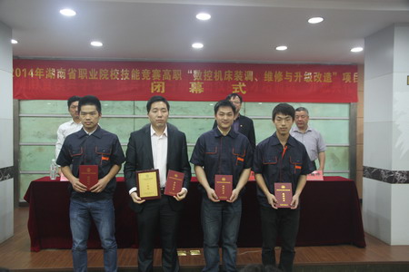 我院代表队以扎实专业技术和默契的合作能力,积极奋战,获得2014年湖南省高职院校“数控机床装调、维修与升级改造”项目技能大赛第一名。