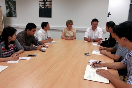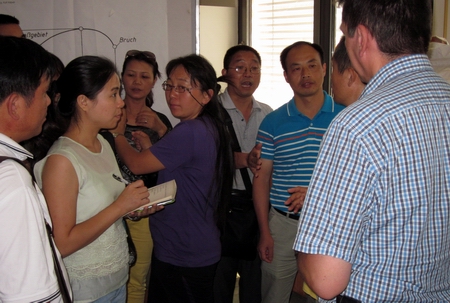代根多夫应用技术大学负责国际交流的副校长Klaus Nitsche博士和学校相关部门负责人Wolfgang Stern女士还专门与我院部分教师进行了座谈。双方重点交流了校企合作、教师提升、学生管理、校际交流与合作等内容。Klaus Nitsche博士今年11月份将前往我国考察,我院研修团团长在向他简要介绍学院情况后,代表学院欢迎Klaus Nitsche博士一行来我院指导、交流。