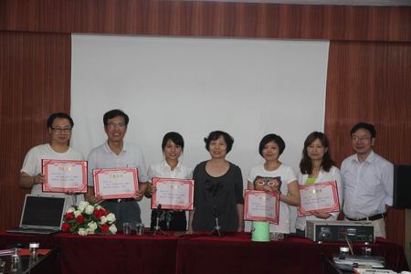 学院纪委书记李玲(中)为机关二获奖选手颁奖 李力夫、段蓉蓉两位老师获一等奖