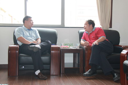 院长刘建湘(右)与梁国胜记者(左)探讨当今职业教育发展方向和面临的问题