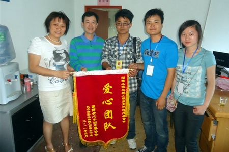 长沙市彩虹孤残儿童中心工作人员为志愿者颁发锦旗
