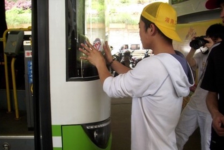 活动最后,志愿者们将一张张“奉献、友爱、互助、进步青年志愿者标志”贴在公交车上,寄托着他们的祝福。