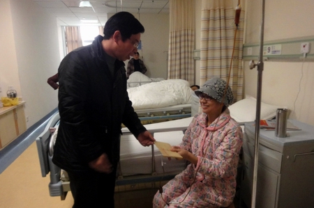 3月11日,我院商贸旅游系系领导及辅导员一行前往医院探望符双同学并送去慰问金。符双是商英09级2班的学生,出生于农村家庭,家境较为贫困,在2010年下学期被诊断患有肿瘤,高昂的治疗费用使得这个本不富裕的家庭生活更加拮据。该生在2010年下学期期末已在医院动过肿瘤切割手术,现仍在治疗之中。商贸旅游系自主成立了“爱心小组”定期去医院看望和慰问。在学院师生的关心和鼓励下,符双同学现在心情乐观,并一直在积极配合医生的治疗与病魔抗争,病情比较稳定。