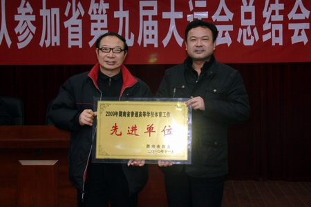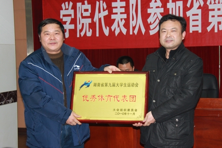 男篮队、女排队及田径队的教练员、运动员代表相继上台发言,他们感谢学院领导对体育事业的支持,简要回顾了集训期间全体运动员不畏艰难、坚持训练、备战大运会的过程,并表示在今后的训练当中将继续努力,不断提高自身素质,为学院获得更多的荣誉做出应有的贡献。随后,代表团团长周立华副书记将“省普通高等学校体育工作先进单位”、“第九届大运会优秀体育代表团”的奖牌传递给廖洪元书记和刘建湘院长,男篮队、女篮队、女排队和田径队教练员分别将在第九届大运会上获得的奖杯交给了相应领队领导,完成了奖牌交接仪式。